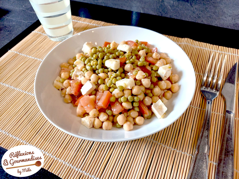 Coupez les tomates et le fromage de chèvre en petits morceaux. Ajoutez-y les pois chiches et les petits pois.