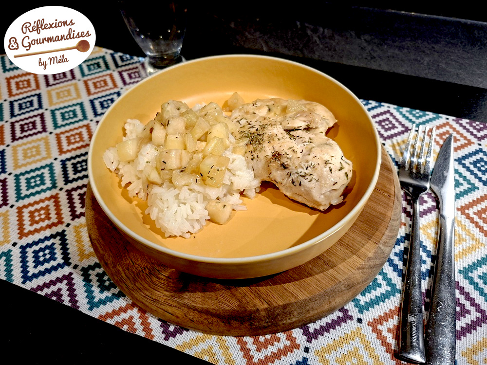 Faites cuire votre poulet dans une poêle huilée. Une fois qu’il est bien coloré de tous les côtés, ajoutez les poires et laissez encore cuire 5 minutes en mélangeant. Versez ensuite la crème, le sirop d’érable et mettez les épices ainsi que le thym. Laissez mijoter jusqu’à ce que le poulet soit cuit à cœur. J’ai laissé une petite demi-heure. Cette recette peut se préparer en avance.